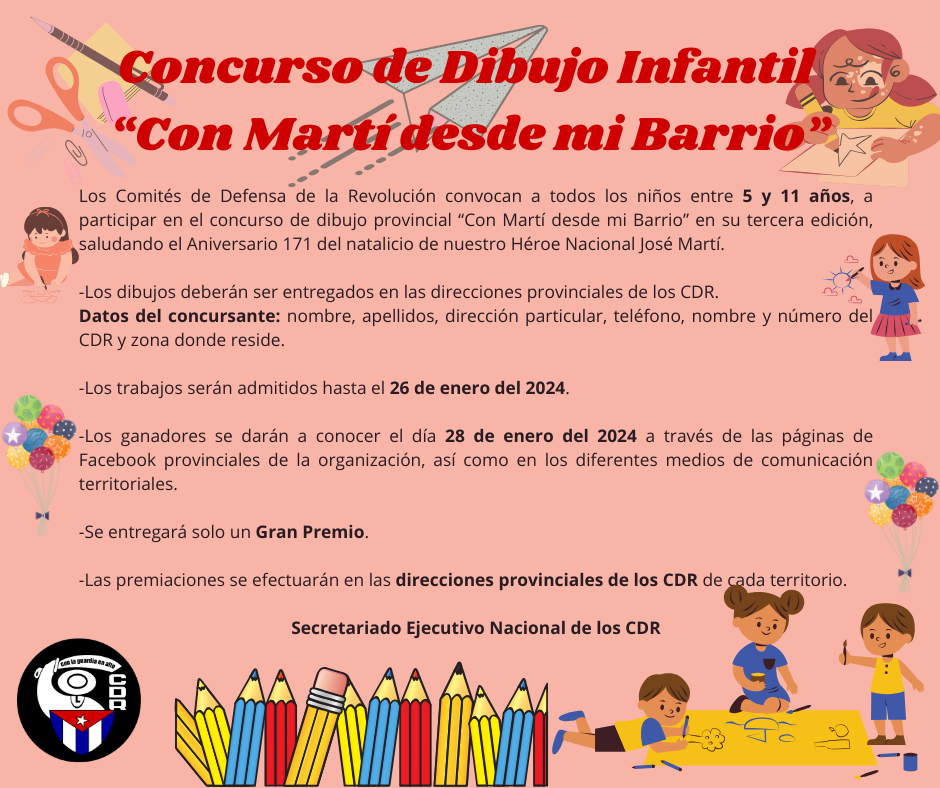 Los Comités de Defensa de la Revolución (CDR) convocan a todos los niños entre 5 y 11 años, a participar en el concurso de dibujo “Con Martí desde mi barrio” en su tercera edición, saludando el Aniversario 171 del natalicio de nuestro Héroe Nacional José Martí.